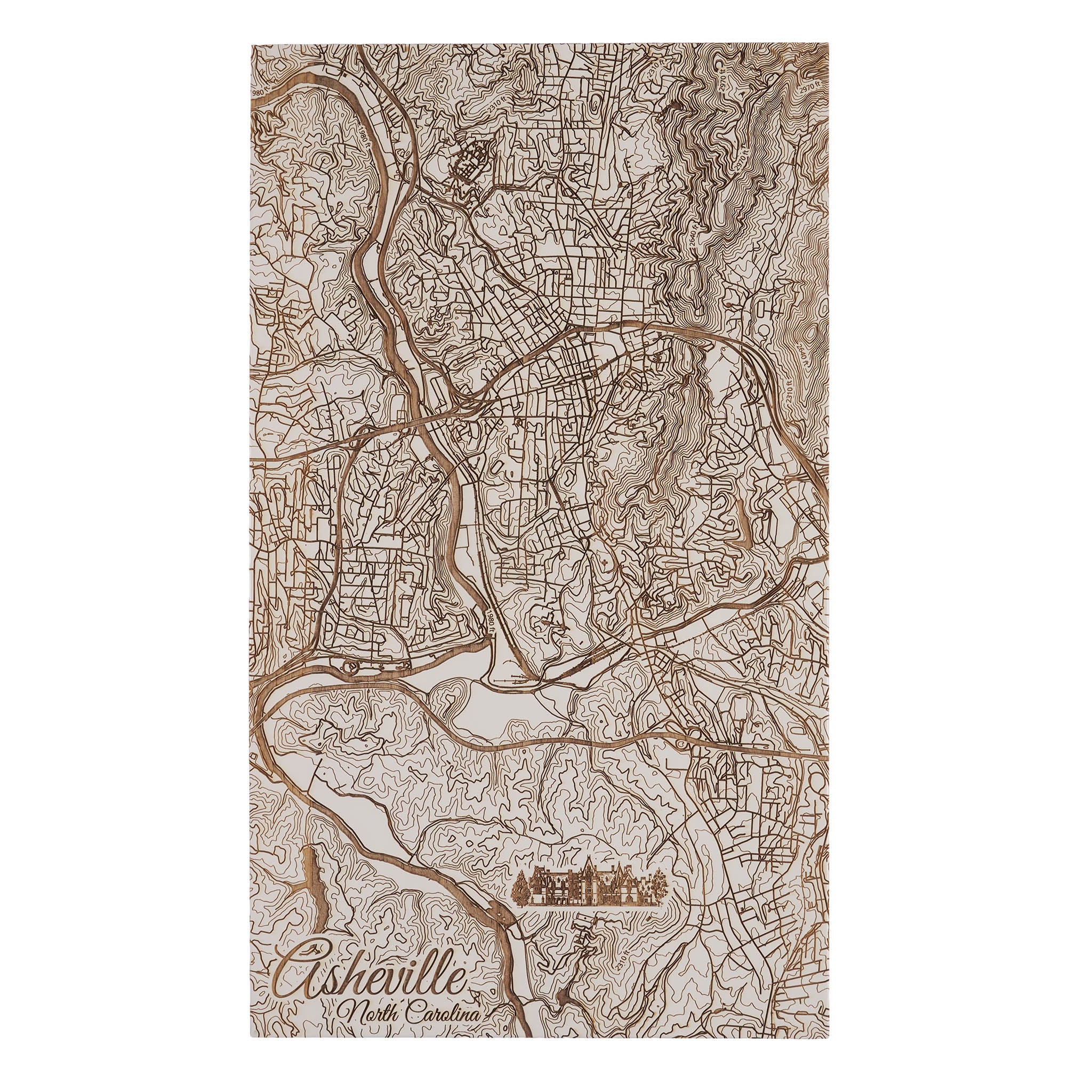Asheville and Biltmore Estate come to life in this engraved wooden map, with roads, rivers, and terrain rendered in rich, layered detail.