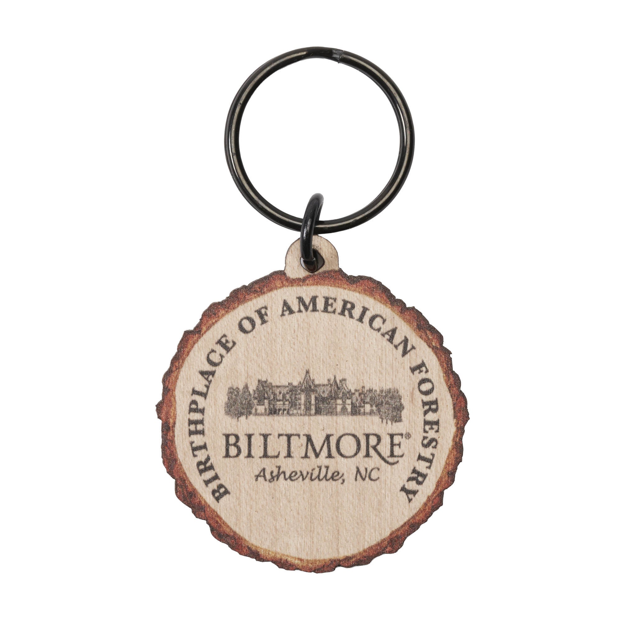 Carry a piece of Biltmore’s forestry legacy with you. This wood slice–inspired keychain features the Birthplace of American Forestry design in a compact, everyday size.