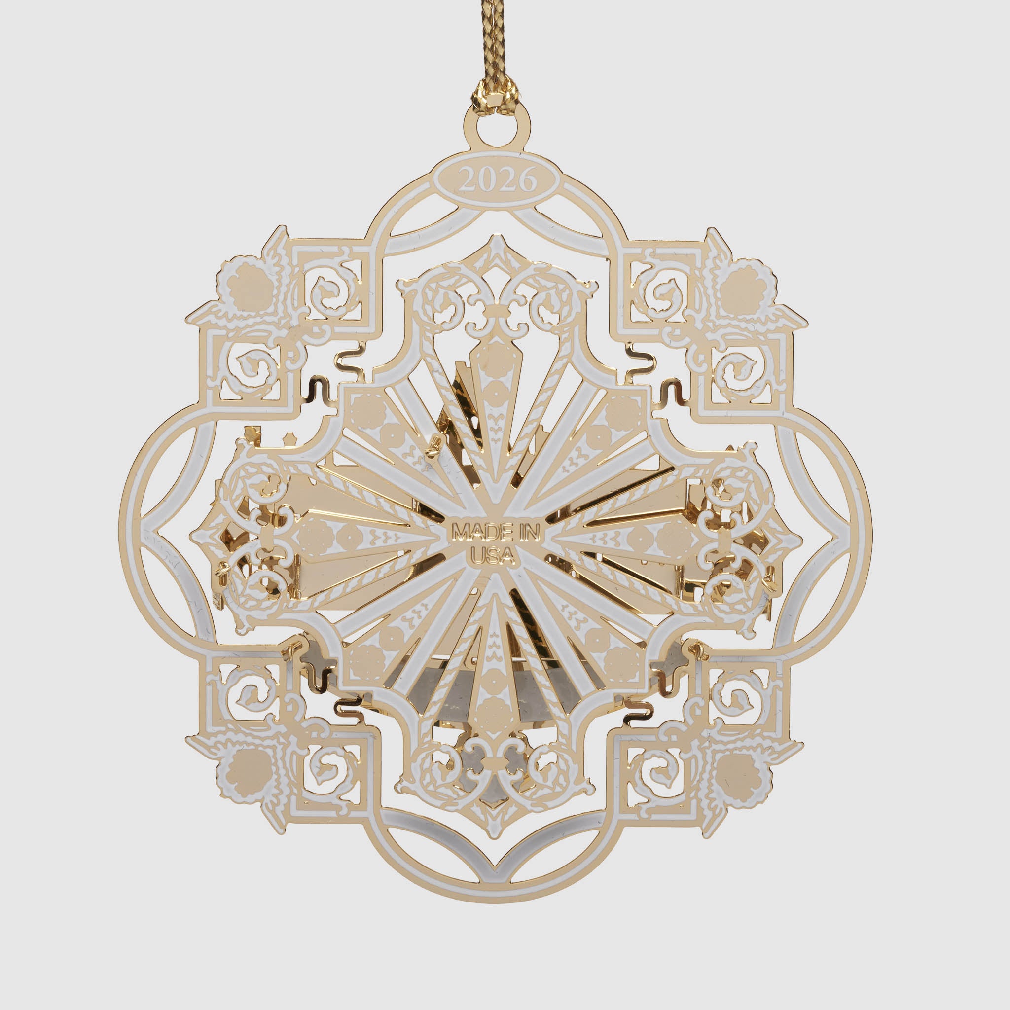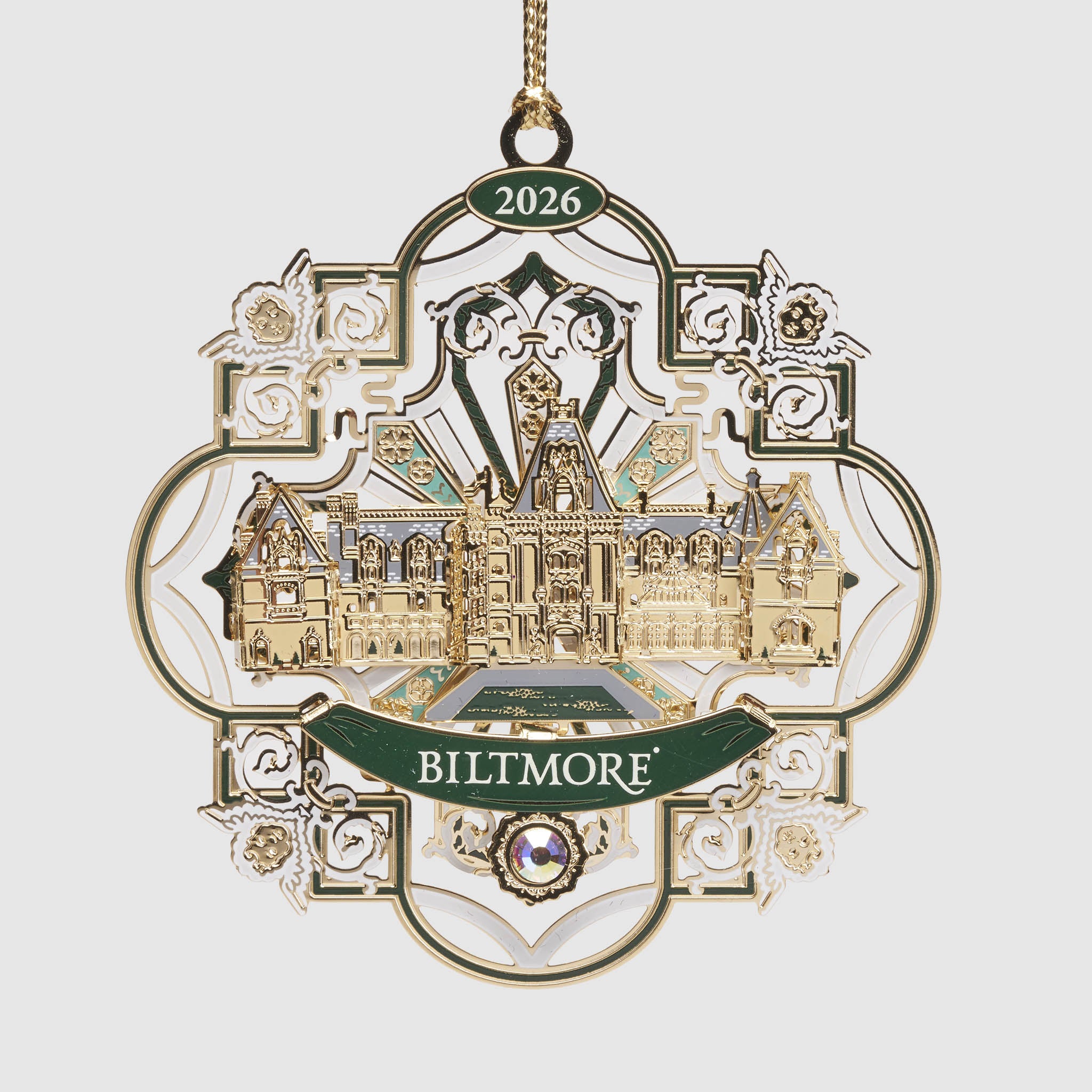 The 2026 Limited Edition Christmas at Biltmore Ornament captures the elegance and grandeur of the estate in a collectible keepsake. This design features a detailed rendering of Biltmore House surrounded by ornate gold filigree, sparkling accents, and the year proudly displayed at the top. Crafted to be treasured for years to come, the ornament arrives in a gold and black gift box with black felt lining—ready for gifting or adding to your own holiday tradition.