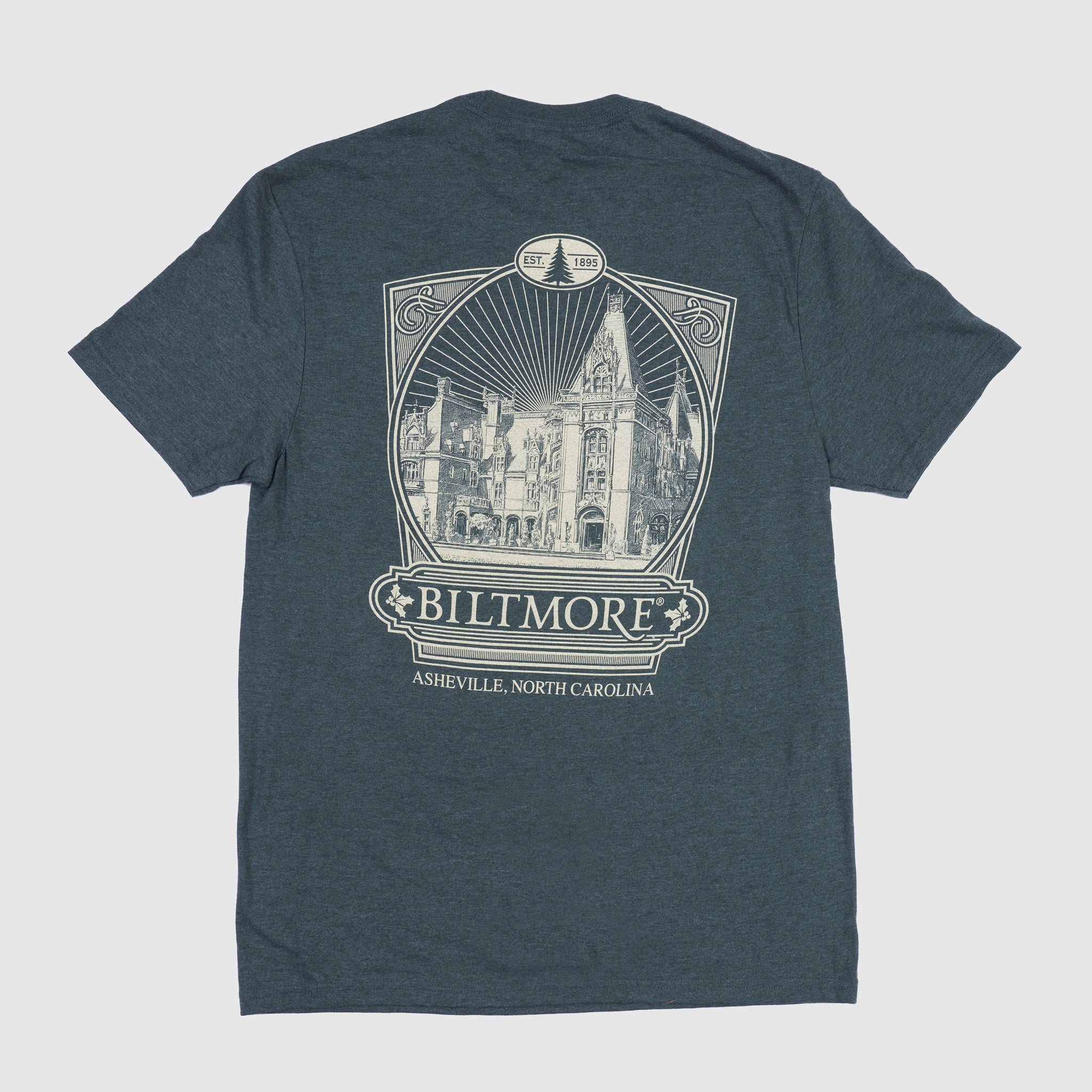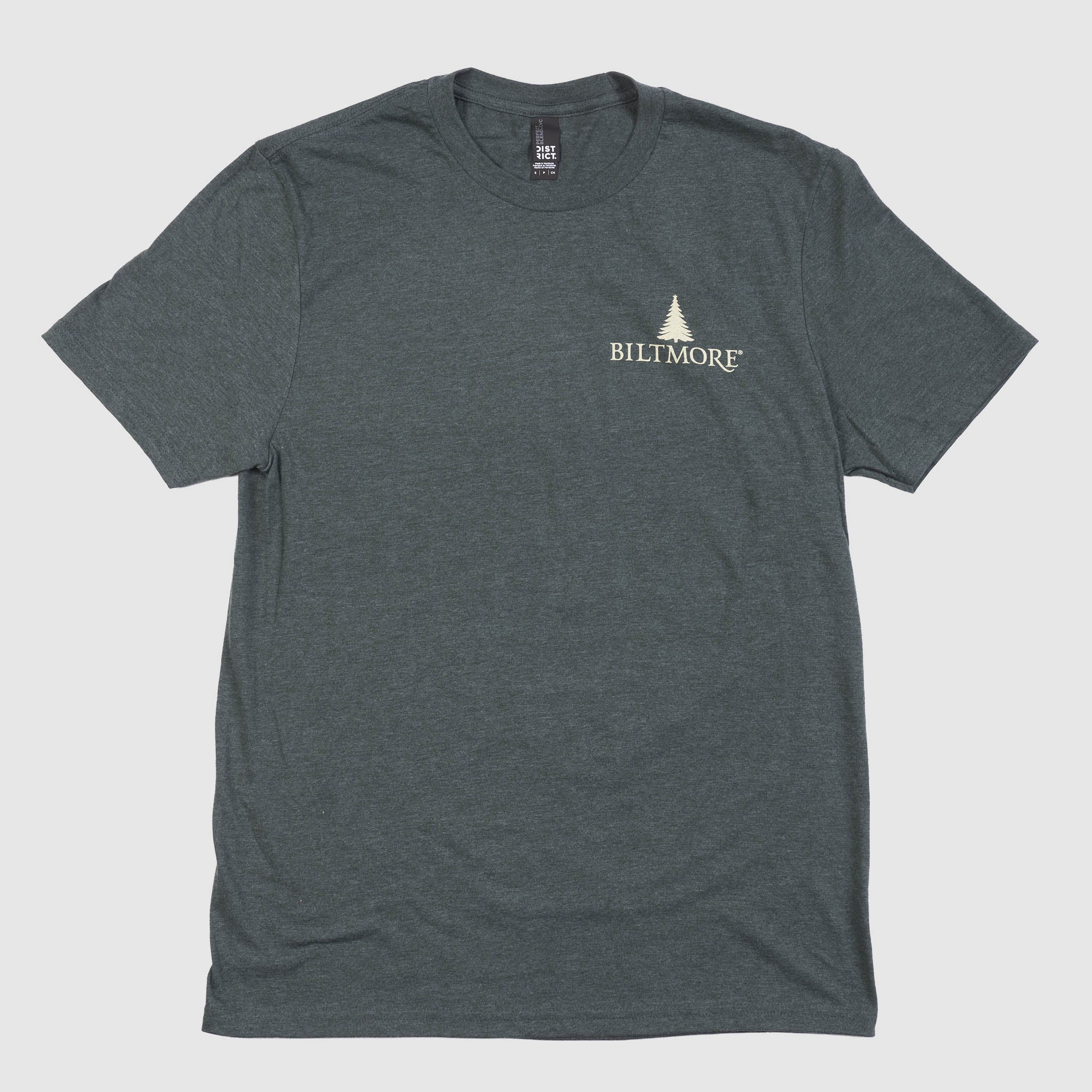 A celebration of comfort and tradition. This soft green tee features a festive tree badge on the front and an ornate illustration of Biltmore Estate on the back.
