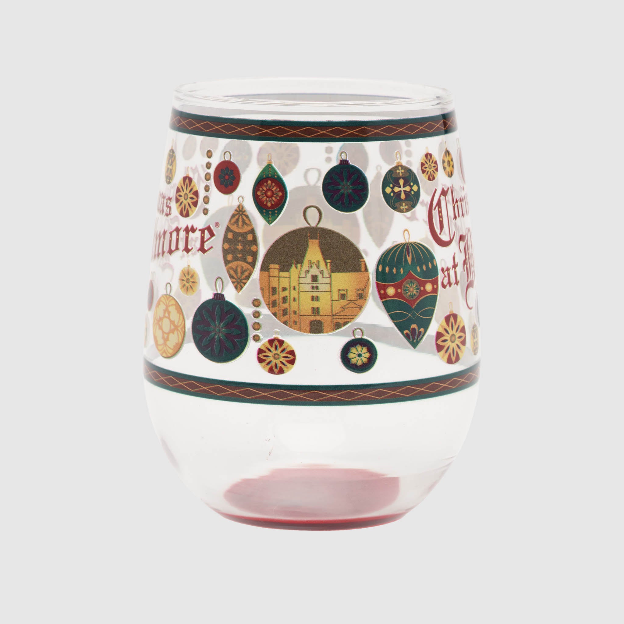 Raise a glass to the season with our Christmas at Biltmore Stemless Wine Glass. This 15 oz. glass is wrapped in a cheerful holiday pattern with vintage-inspired ornaments and Christmas at Biltmore lettering across the front. The red-tinted glass bottom adds a playful twist, catching the light and adding a pop of color to your table. Ideal for wine, mocktails, or sparkling cider.