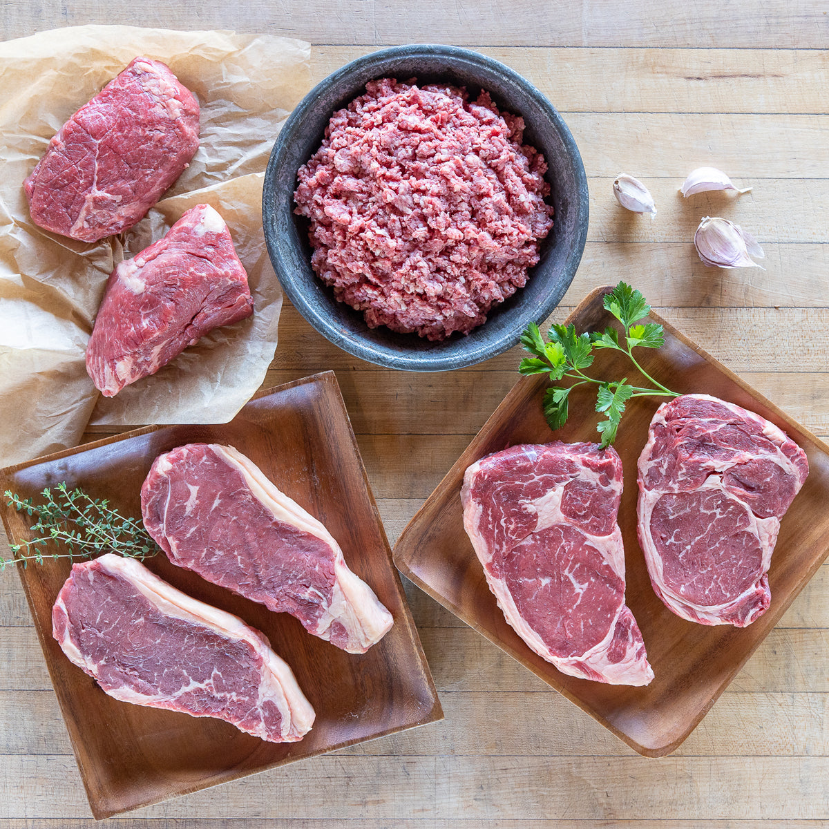 Sample this wonderful assortment of our premium steaks, whether for a casual evening or a special occasion. This premiere Biltmore® Grown Steak Sampler is premium quality with 14-day, dry aged flavor. This farm to table product is pasture based angus beef and has no hormones added.