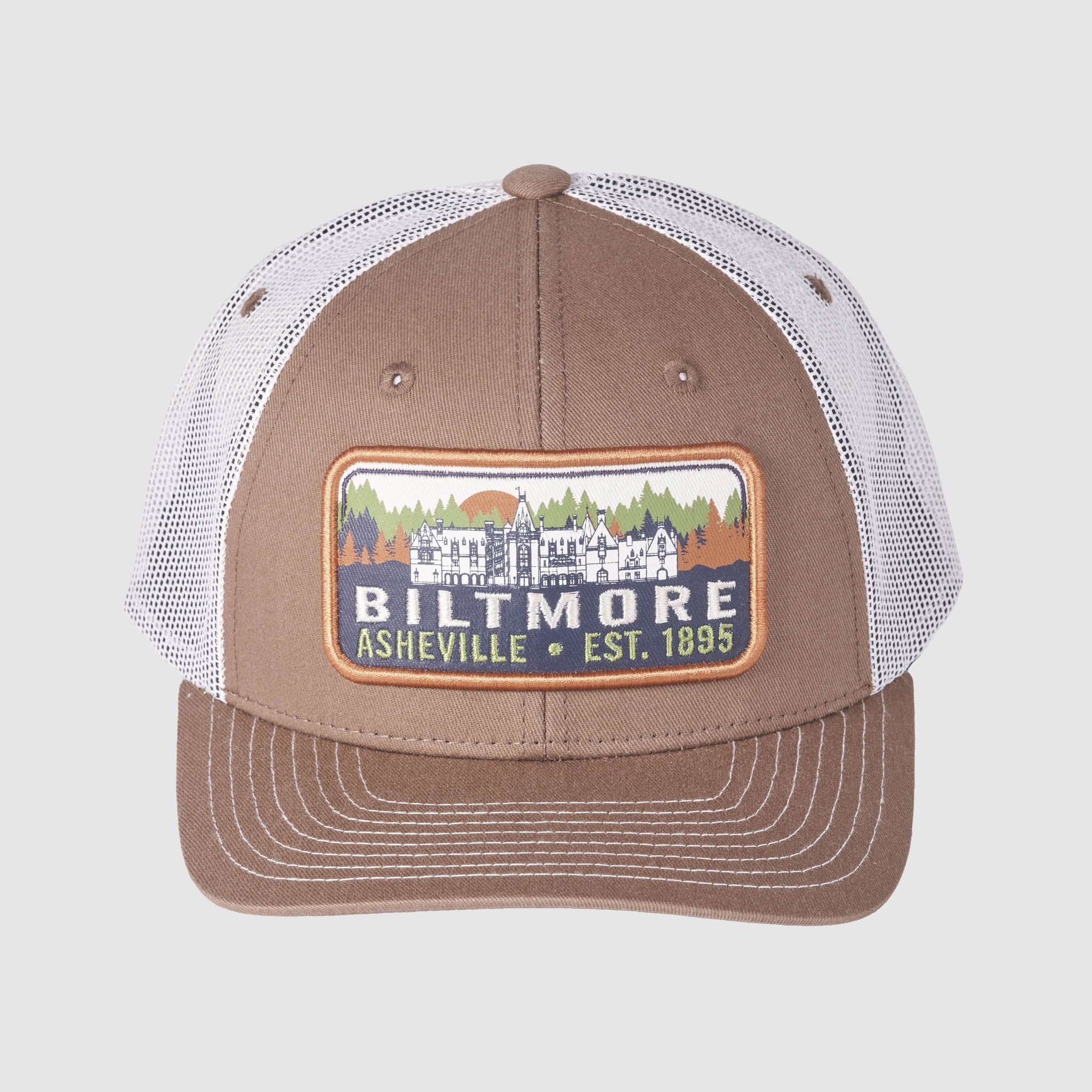 - Coffee-colored front panels, white mesh side and back panels, with embroidered fall at Biltmore badge in autumn colors; detailed front façade of Biltmore House and Biltmore logo in white, and Asheville, Est. 1895 in sage green