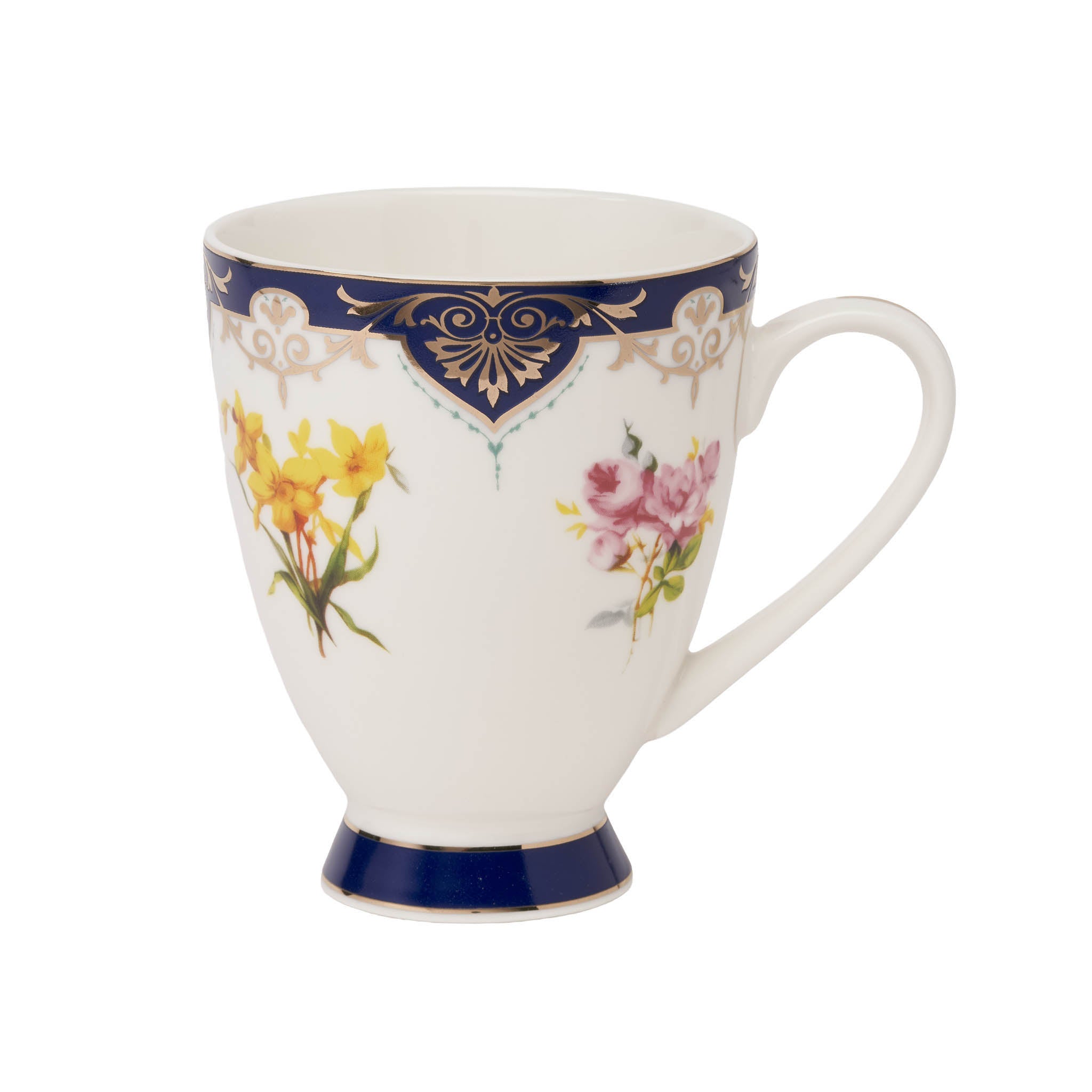 This Vanderbilt china mug brings classic pattern and refined detail to everyday use. Crafted from new bone china, the mug features the Vanderbilt floral design accented with gold foil detailing and finished with hard-fired decals for lasting color. With a comfortable handle and a 9-ounce capacity, it is well-suited for your morning coffee, afternoon tea, or to display as part of a coordinated collection.