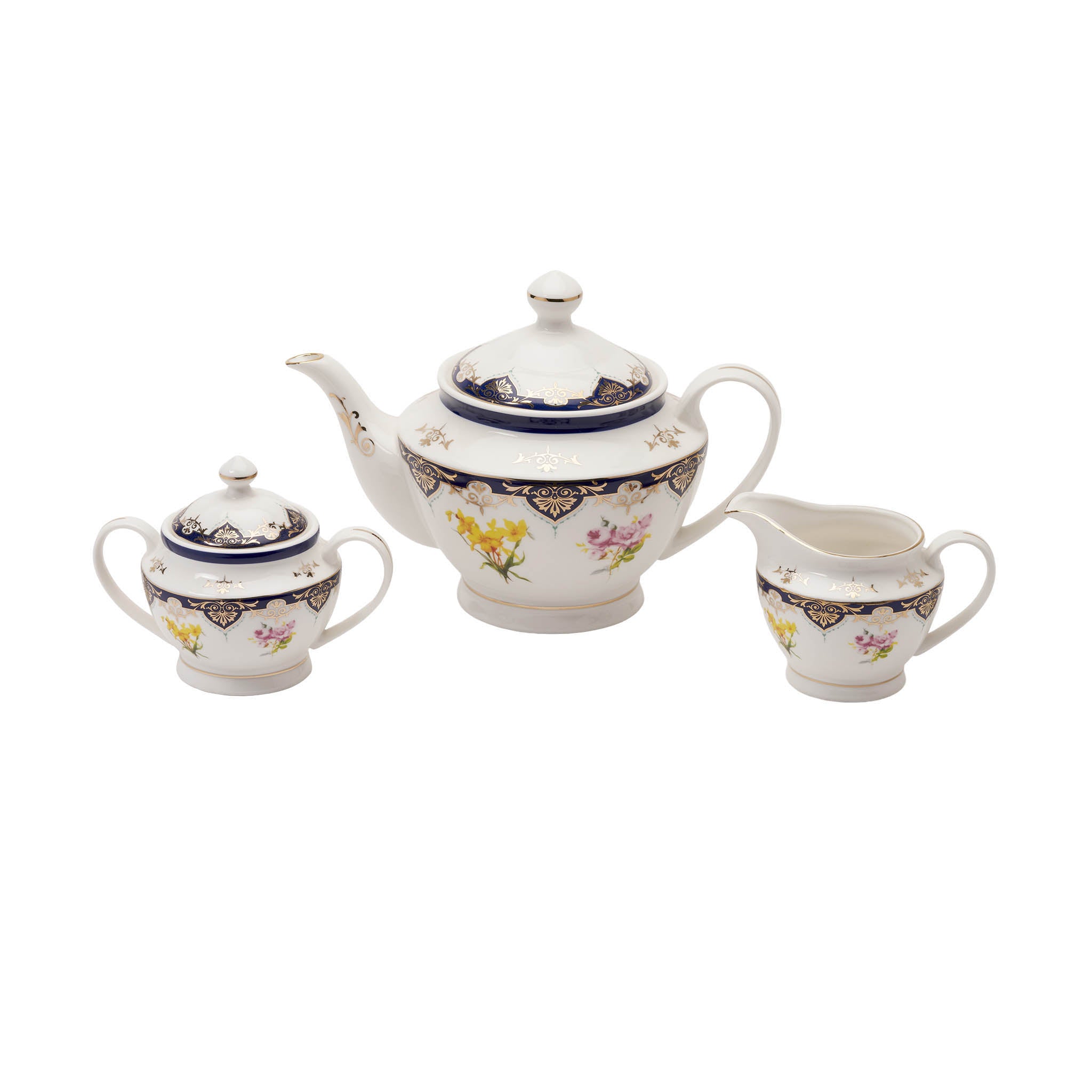 This three-piece Vanderbilt china tea set offers a cohesive and elegant approach to tea service. Crafted from new bone china, each piece features a coordinating floral design accented with gold foil details. The set includes a generously sized teapot paired with a matching sugar bowl and creamer, creating a polished presentation for entertaining or display. Finished with hard-fired decals for durability and packaged in a gift box, this set is well suited for collectors and those who appreciate classic tableware design.